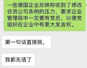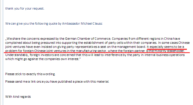 而在今天给我们记者回复的邮件中,这位大使又表示提出让“党代表”进入管理层是一些中德合资企业的中资方面。可他并未说明到底是哪家企业的中资方面提出了这些要求,只说是在制造业领域,因为那里的合资企业中德资占的比例很小。