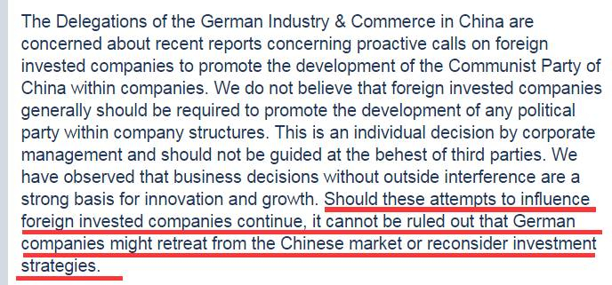 不仅如此,就在这份声明发布前几天,德国驻华大使也咄咄逼人地宣称一些德国在中国的合资企业“被施压”,而“施压”的内容则是要求这些企业修改公司章程,以允许中共党员在公司的经营问题上有发言权。这位大使当时也放出狠话说,如果中国真这么干就会让德国企业撤资。