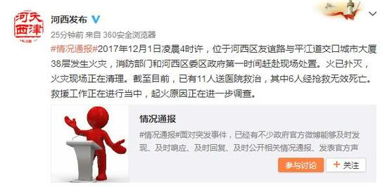 #情况通报#2017年12月1日凌晨4时许,位于河西区友谊路与平江道交口城市大厦38层发生火灾,消防部门和河西区委区政府第一时间赶赴现场处置。火已扑灭,火灾现场正在清理。截至目前,已有11人送医院救治,其中6人经抢救无效死亡。救援工作正在进行当中,起火原因正在进一步调查。