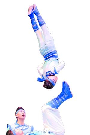 大洋网讯 前空翻、后空翻、被同伴蹬起在空中连续翻滚,又被稳稳地接住。