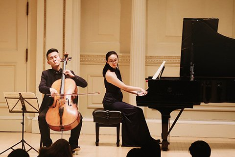 青年大提琴演奏家方义嘉(左)与钢琴博士生李欣,在美国辛辛那提音乐学院演奏。主办方供图
