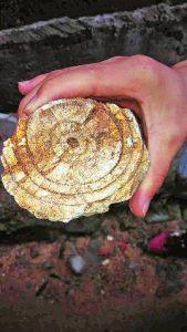 经现场初步测量,化石断裂为13节,长度约1米左右,总重量约4.8公斤,化石最粗1节有茶杯口粗细,随后依次逐渐变细。