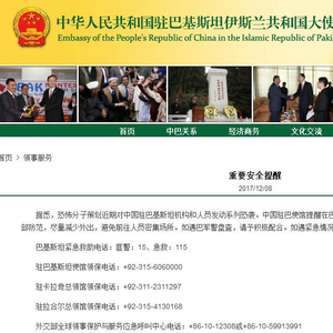 12月8日电 中国驻巴基斯坦大使馆网站消息称,据悉,恐怖分子策划近期对中国驻巴基斯坦机构和人员发动系列恐袭。