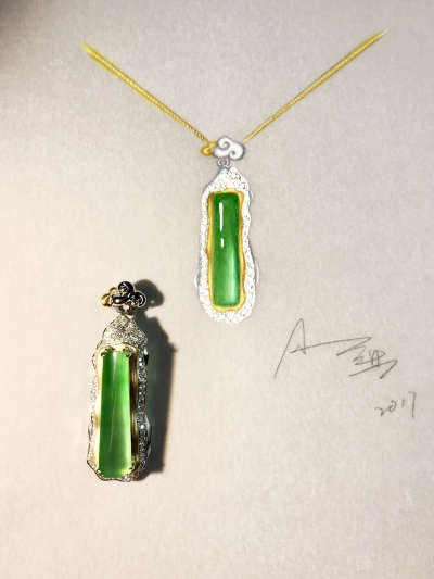 在岳琳的工作室里,记者看到了很多她设计的精美珠宝手稿,每一张图的绘制都无比细腻,堪称艺术品。而这其中,她最常用的设计元素,与扬州玉雕不谋而合——白玉、翡翠等。
