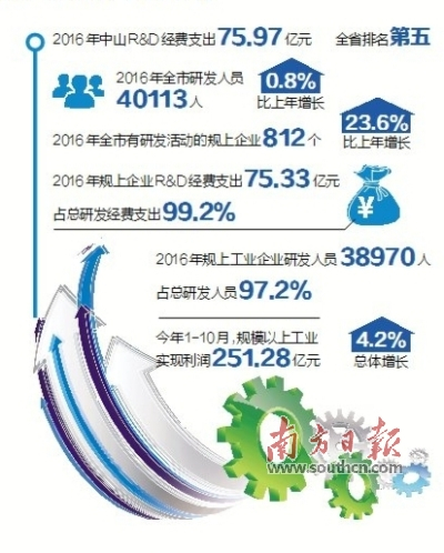 近日,中山市统计局发布了中山市科技研发创新现状分析。数据显示,2016年中山R&D经费支出75.97亿元,全省排名第五,比上年增长7%。