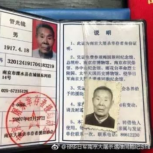 管光镜1917年4月出生,1937年他在溧水东河沿边目睹日军飞机来袭轰炸,他躲在大石头底下侥幸生还。南京沦陷后,他还多次目击日军在南京郊区屠杀当地无辜百姓。