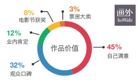 那么,他们对于电影作品的价值观又是如何呢?45%的受访者认为拍一部电影作品最大的价值是要让自己满意,另外32%则更在意观众的口碑,很少导演将“票房大卖”或“电影获奖”当成一部作品的价值体现。