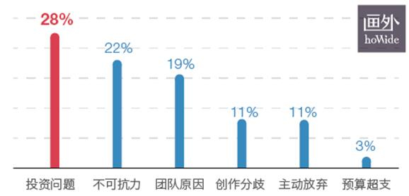 即使作品找到投资成功立项了,仍然有可能失败:40%的受访者曾经历过项目终止,其中一半是由于投资方撤资,另一半的终止原因包括团队执行力、审查、创作分歧和自己主动放弃等。