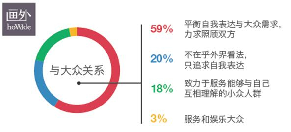 59%的受访者会去平衡自我表达和大众之间的需求,力求照顾双方。20%的导演则“不考虑外界看法,只表达我想表达的”,差不多同样多的导演致力于服务有品位的小众人群,只为能够与理解作品的人服务,同时,也存在少数导演致力于服务和娱乐大众,创作他们喜闻乐见的作品。