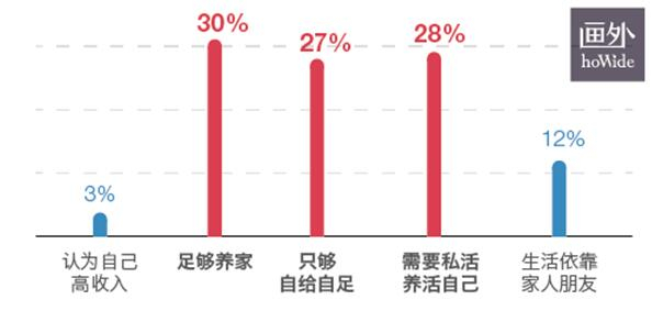 尽管电影导演目前在我国绝对属于高收入人群,但对于还没有爬到金字塔顶层的年轻人们来说,日子并没有富得流油:只有2名受访者认为自己是高收入人士,接近三分之一的受访者表示“养得起家“,同样数目的受访者”只养得起自己“,剩下40%的受访者收入水平都在温饱线以下,需要靠家人朋友或者副业才能生存。