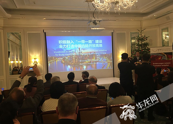华龙网12月12日16时33分讯(特派杜塞尔多夫首席记者 佘振芳)一座位于内陆的山城,如何实现通江达海?一条贸易大通道,如何将德国、东盟、新加坡等相隔数万里的地方紧密相连?当地时间12月11日,“2017感知中国·重庆篇——德国行”活动在德国西部商业名城杜塞尔多夫举行,活动现场,沙坪坝区向德国政府及企业进行了经济招商推介。本活动由国务院新闻办指导,重庆市政府新闻办等单位主办,沙坪坝区政府新闻办、西部物流园等单位承办。