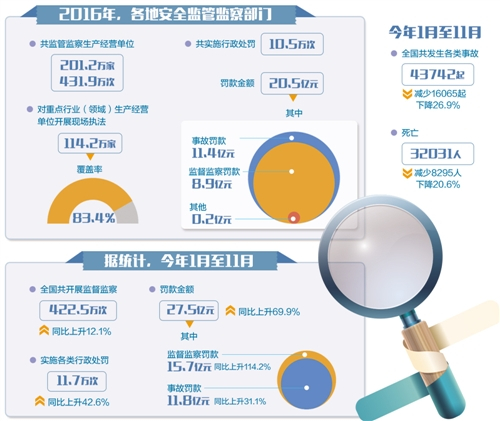 2016年,各地安全监管监察部门共监管监察生产经营单位201.2万家、431.9万次;对重点行业(领域)生产经营单位开展现场执法114.2万家,覆盖率83.4%。共实施行政处罚10.5万次,罚款金额20.5亿元,其中监督监察罚款8.9亿元、事故罚款11.4亿元。据统计,今年1月至11月,全国共开展监督监察422.5万次,同比上升12.1%;实施各类行政处罚11.7万次,同比上升42.6%;罚款金额27.5亿元,同比上升69.9%。其中:监督监察罚款15.7亿元,同比上升114.2%;事故罚款11.8亿元,同比上升31.1%。通过实行分级分类监管、加大执法力度、强化事故预防,真正使守法企业得到保护、减轻负担,使违法企业和隐患多的企业受到应有的惩处,维护正常的安全生产秩序。