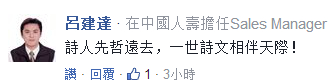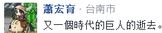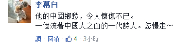 众多台湾网友也纷纷留言悼念余光中,有网友称,“一缕清风似人在”、“写出了回味无穷的经典”、“诗人先哲远去,一世诗文相伴天际”、“他的中国乡愁,令人怀伤不已。一个流着中国人之血的一代诗人。您慢走”、“又一个时代的巨人的逝去”,还有台湾网友留言讽刺蔡当局“‘去中国化’可以少一个阻力了!”