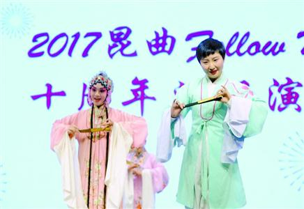 “Follow Me昆曲跟我学”第十七期结业典礼暨开办十周年庆典活动现场,学员们登台表演。 /晨报记者 何雯亚