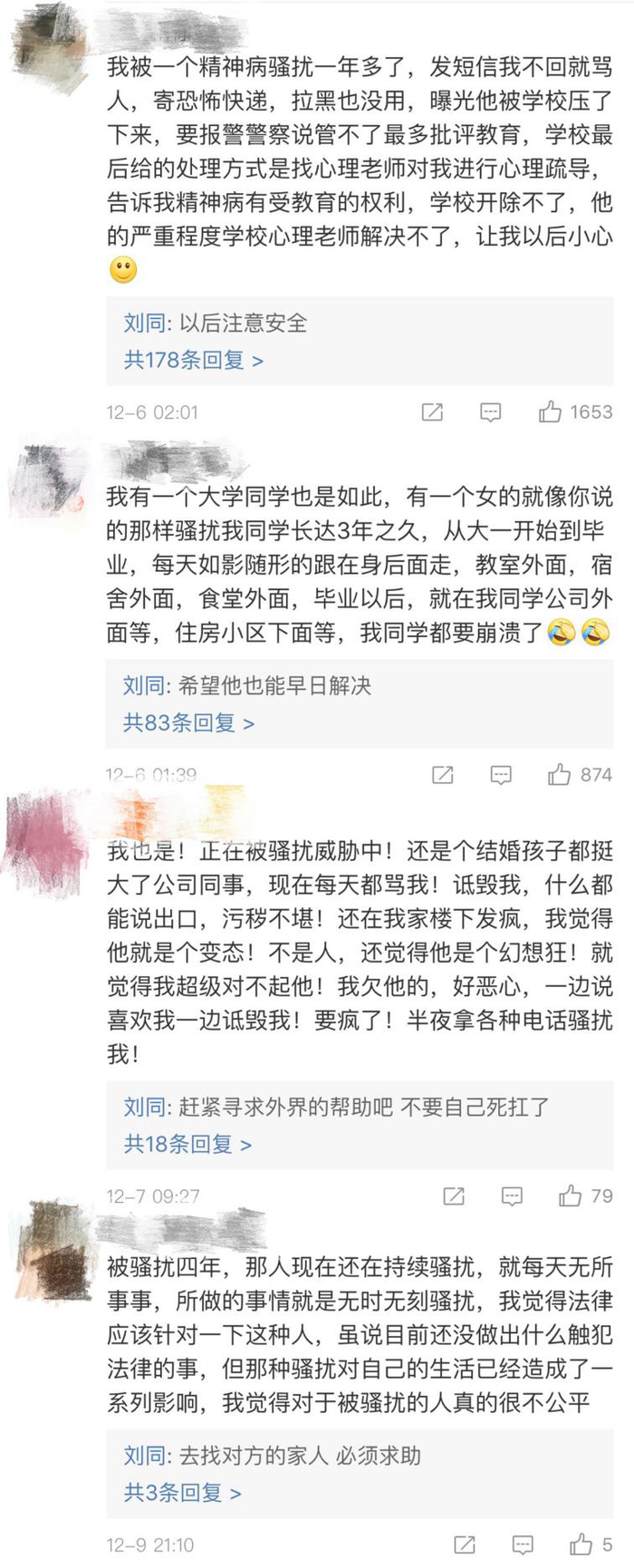 网络上,这样长期尾随骚扰的粉丝被称为“私生饭”,有很多人认为是公众人物才有的经历,但刘同将其称为“作为一个普通人长达一年的无奈”,引起了许多非公众人物的普通网友的共鸣。不少网友也评论回复说自己在生活中遇到过类似的跟踪和骚扰,非常理解这种崩溃而无助的感觉。