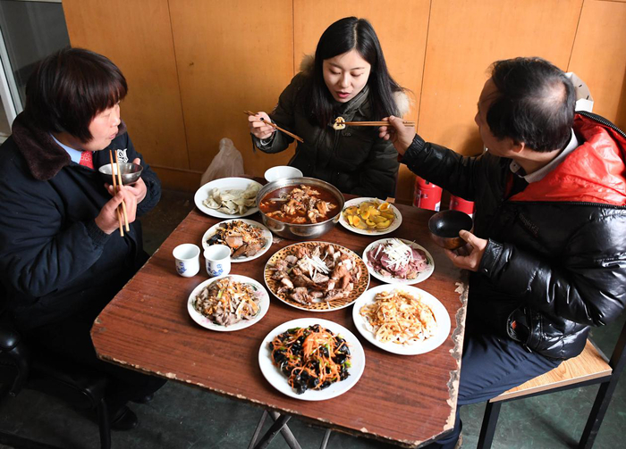 1月25日,磨滩分区亭值守员赵海波、胡芳荣夫妇和女儿笑笑一起吃团圆饭