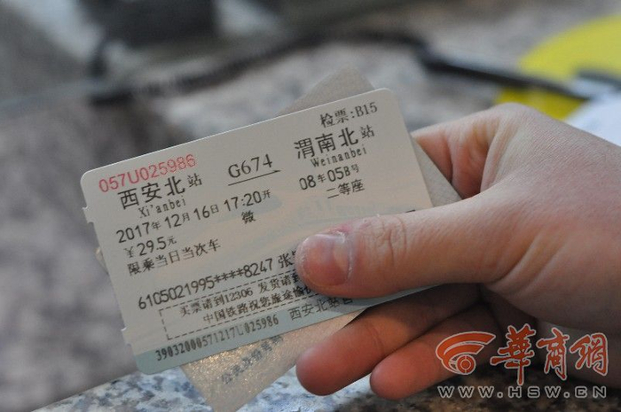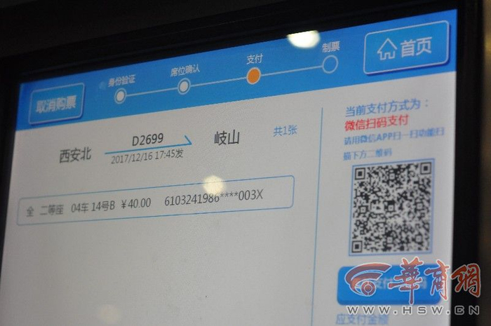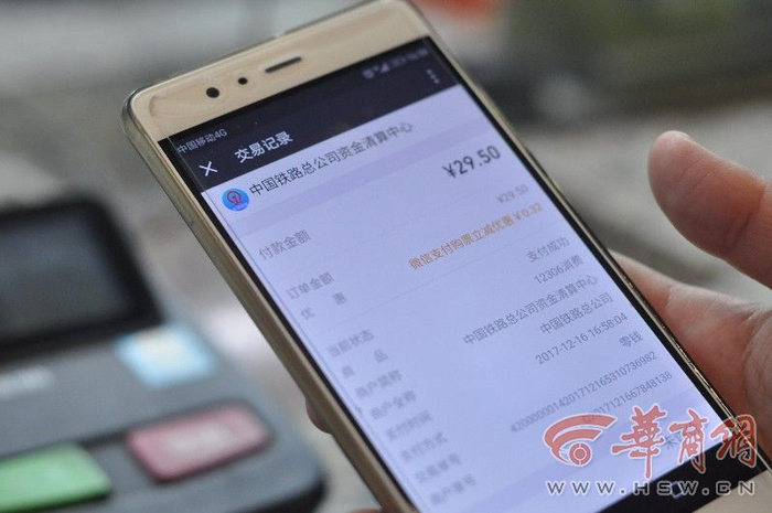 12月16日下午4时许,张女士在西安北站售票厅售票窗口购买G674西安北至渭南北的高铁票,在支付时,工作人员提醒她已经可以使用微信支付。在确认订单后,收款机会生成一个订单二维码,旅客只需用微信扫一扫即可支付票款。张女士用微信扫二维码后,支付成功,票面价格是29.5元,微信支付购票立减优惠0.32元。最后打印的火车票上标注着“微”字,表明这是一张通过微信支付购买的火车票。