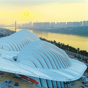 坐落于邕江之畔,与青秀山隔江相望的广西文化艺术中心场馆大气美观,外部弯弯曲曲的钢结构形成山峰造型,线条流畅、气势恢宏;9万平方米的“云棚”,若有阳光直射,即在地面呈现黑白琴键的造型,让人震撼。
