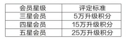 评定标准:其中,三星级会员需5万升级积分,四星级会员需15万升级积分,五星级会员需25万升级积分。