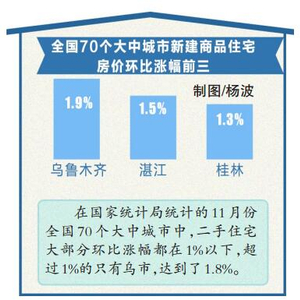 记者了解到,受国家“分类调控、因城施策”房地产市场调控政策影响,目前全国一二线热点城市房价全面回落,在国家统计局统计的11月份全国70个大中城市中,新建商品住宅房价环比上涨超过1%的只有9个城市,其中涨幅前三的分别为:乌鲁木齐(1.9%)、湛江(1.5%)和桂林(1.3%)。二手住宅方面,70个城市中大部分环比涨幅都在1%以下,超过1%的只有乌鲁木齐一个城市,达到了1.8%。在同比数据方面,乌鲁木齐新建商品住宅同比上涨6%,在70个城市当中排名35位,二手住宅同比上涨8.6%,在70个城市中排名第9位。