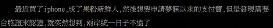 海外网12月21日电 近日,有台湾地区网友在批踢踢(ptt)论坛上发文称,“很想申请梦寐以求的支付宝,发现需要台胞证来认证,就突然想到,两岸统一的日子不远了”。