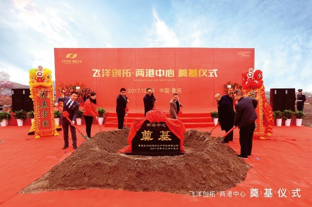 华龙网12月21日9时讯 2017年12月19日上午,由重庆飞洋控股(集团)有限公司和重庆创拓房地产开发有限公司在渝北区创新经济走廊联合打造的飞洋创拓·两港中心--总部基地项目正式开工奠基。渝北区政协党组成员、副主席周恒丰先生、创新经济走廊常委副总经理林超先生、龙湖物业首席市场官兼重庆公司总经理张椿梅女士、两港中心投资方、合作单位及媒体朋友等莅临参加奠基仪式,并为项目开工奠基培土。