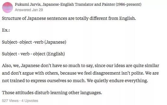 日语句子结构与英语完全不同。日语是“主语-宾语-动词”,英语是“主语-动词-宾语”。另外,我们日本人没有太多的话要说,因为我们的想法都很相似,我们不跟别人争辩,因为觉得分歧是不礼貌的。我们没有受到过如何表达自己的训练。我们静静地忍受着一切。这些态度妨碍了我们学习其他语言。