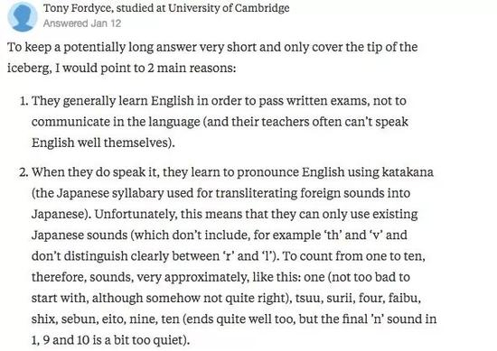 我会指出两个主要原因,一是他们学习英语是为了通过笔试,而不是为了用英语交流;二是当他们说英语时,会用片假名来发音(类似于用拼音标注英文),这意味着他们只能使用现有的日文发音(不包括“th”和“v”,不能明确区分“r”和“l”)。简单来说,就是日本人英语说不好得赖日本文化和教学方式。