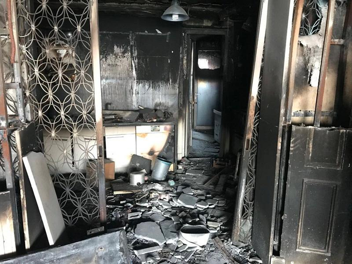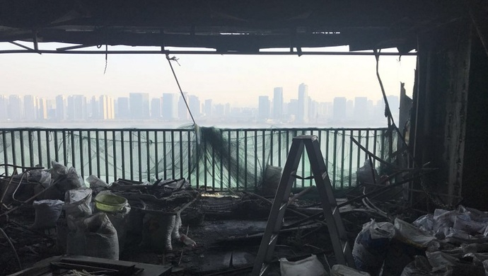 蓝色钱江小区二期2幢1802室,还保持着大火肆虐过后的狼藉。360多平米,四室两厅,还有个专门的保姆间。曾经精装修的宅邸,被半年前的那场火烧得露出了红色的墙砖,客厅精心选材的隔断只剩下赤裸的钢架,垂立在杂物遍地的房子中央,所有白墙被浓烟熏得黝黑。屋内的玻璃窗全被大火产生的巨大压差击碎,只有一层单薄的绿色防尘网包裹着外立面,透过疏松的网眼,钱塘江的风光尽收眼底。初冬季节,一阵风吹来,屋内的人打着寒颤,地上的灰烬随风扬动。