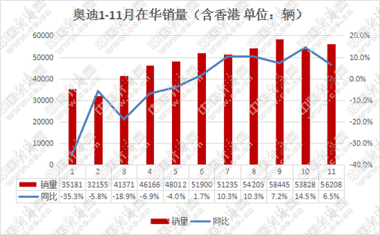 在进口车和个性化车型方面:奥迪A5、奥迪A6 allroad quattro前11个月的同比增长率分别为14%和25%;C级SUV奥迪Q7前11个月总销量实现了22%的同比增长。