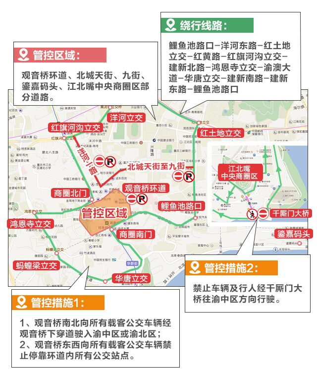 (七)视情况在建新南路、红旗河沟立交、洋河立交、建新东路鲤鱼池路口、李家坪立交等周边区域实施交通管制,进一步控制往观音桥方向的交通流量。受限车辆建议经北滨路、鸿恩寺隧道、渝澳大道、洋河东路、兴盛大道等周边道路绕行通过。