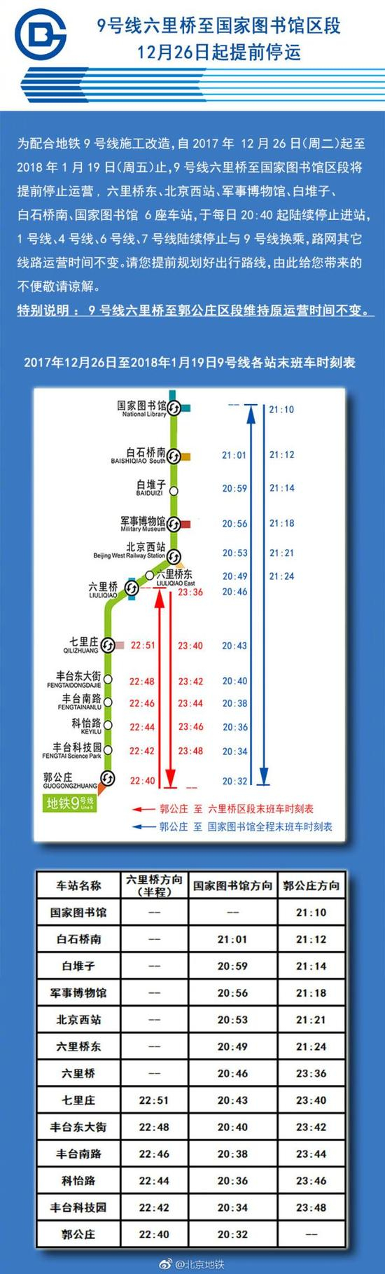 #重要出行提示#为配合地铁9号线施工改造,自2017年12月26日(周二)起至2018年1月19日(周五)止,9号线六里桥至国家图书馆区段将提前停止运营,六里桥东、北京西站、军事博物馆、白堆子、白石桥南、国家图书馆 6座车站,于每日20:40起陆续停止进站,1号线、4号线、6号线、7号线陆续停止与9号线换乘,路网其它线路运营时间不变。请您提前规划好出行路线,由此给您带来的不便敬请谅解。特别说明:9号线六里桥至郭公庄区段维持原运营时间不变。各站末班车时刻表如下