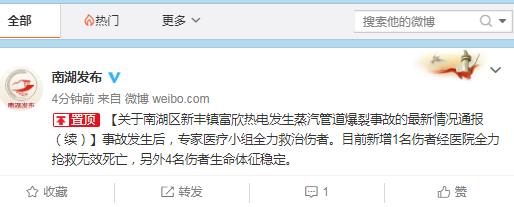 浙江热电厂锅炉蒸汽管爆裂事件续:新增一名死者 政府网站 2017.12.2321:13 关注 [关于南湖区新丰镇富欣热电发生蒸汽管道爆裂事故的最新情况通报(续)]事故发生后,专家医疗小组全力救治伤者。目前新增1名伤者经医院全力抢救无效死亡,另外4名伤者生命体征稳定。