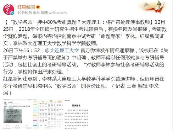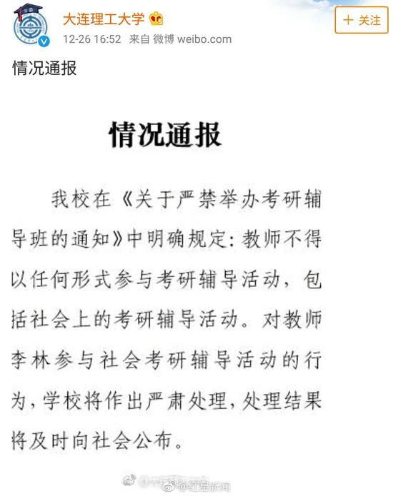 26日下午16:52,@大连理工大学 官方微博发布情况通报称,该校已在《关于严禁举办考研辅导班的通知》中明确,教师不得以任何形式参与考研辅导活动,包括社会上的考研辅导活动。“对教师李林参与社会考研辅导活动的行为,学校将作出严肃处理。”
