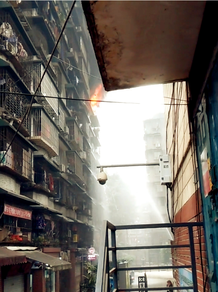 失火现场的附近居民拍摄到了当时的救援画面,从消防喷头喷出的水柱猛烈的喷扫着高层住户家中的明火,楼宇间的烟雾层层叠叠,画面触目惊心。