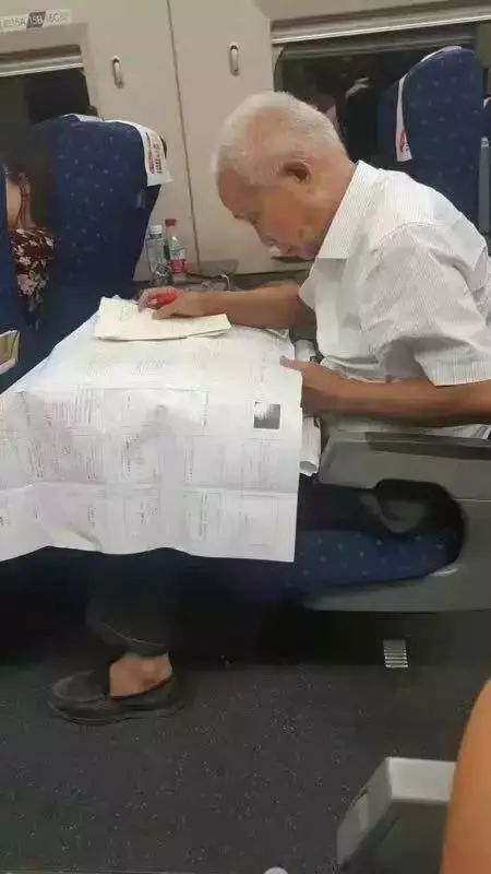 高铁二等座上,白发苍苍的老人拿着笔纸在修改校对着什么。赤脚穿旧鞋,神情专注。