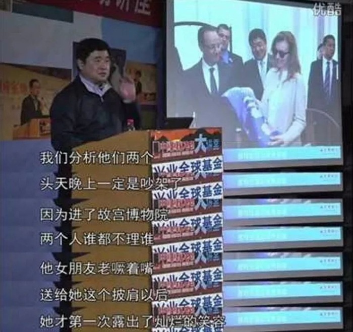 法国前总统奥朗德和前女友来华时,参观故宫博物院。单院长觉得他俩前一晚肯定吵架了,多亏自己送了他女朋友一条披肩,她才开心点。