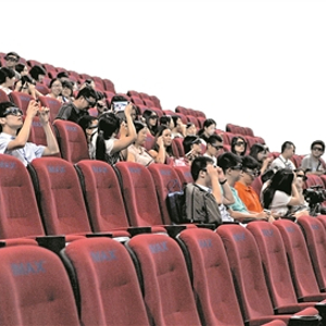 部分观众戴上3D眼镜,等待电影的开始。
