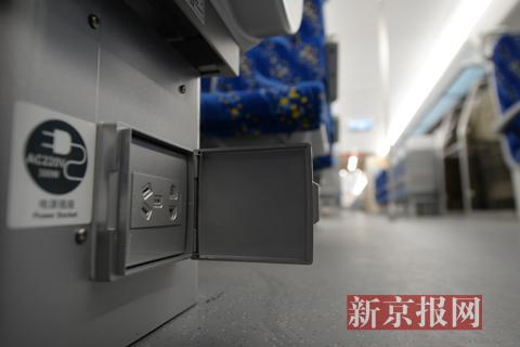 “京通号”每个排座位下方都有电源插口,整车提供无线网络接入服务。新京报记者 吴江 摄