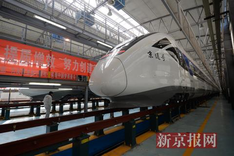 新京报记者今天下午在北京动车段北京西动车所提前看到了 “京通号”,“京通号”车型为CRH6A型动车组,由北京动车段北京西动车所负责列车车底的检修任务。