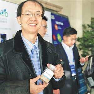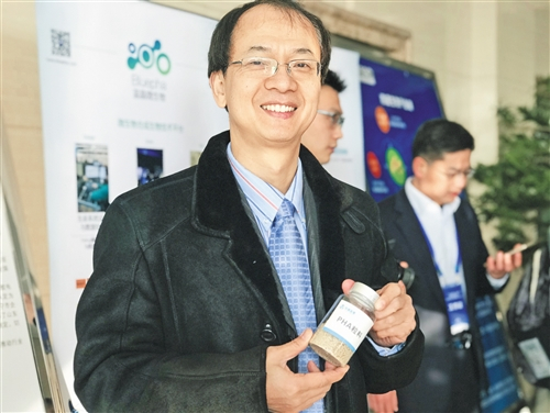 1、陈国强教授向记者展示用新一代工业生物技术生产出的PHA粒料样品。