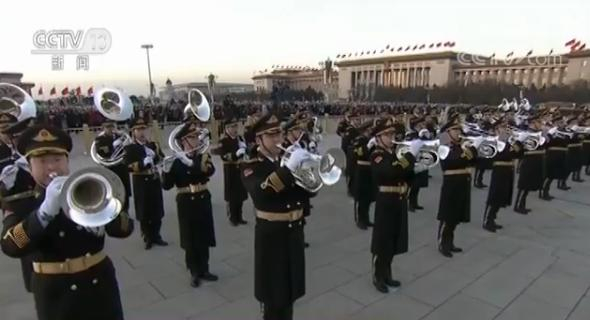 2018年伊始,天安门广场上的升降国旗任务由解放军仪仗队受领任务,天安门广场升国旗仪式也开启了一个崭新的篇章。根据不同情况,升国旗仪式分为两套不同方案,其中较为隆重的是每月第一天升旗方案。该方案仪仗队编队共126人,其中护旗队员96人、礼兵30人,分别着14式陆海空军礼服,仪式开始前,解放军乐团60名演奏员在天安门广场国旗杆基座南侧面向天安门列队,军乐团八名礼号手在天安门城楼前廊就位。仪式开始后,30名礼兵着陆海空军礼服,从天安门城楼中间券门出发,齐步行至金水桥南侧,在两侧呈八字形列队。
