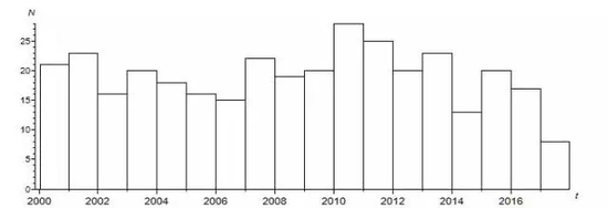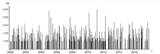 2000~2017年全球MS≥7.0地震频度与M-t图