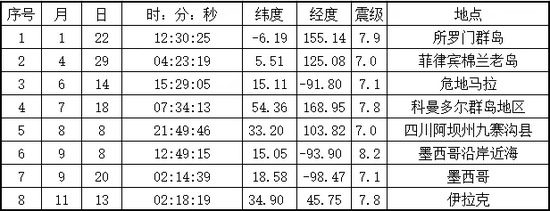 2017年全球共发生7级以上地震共8次。