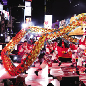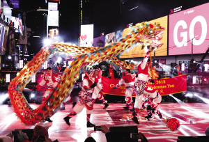 紧接着,来自重庆铜梁龙舞表演队的艺术家们登台,近6分钟的时间里,七男一女通力合作,动作行云流水,刹时,一条金色、红色和蓝色相间,长15米的铜梁龙,迅猛、矫健地飞跃在纽约时报广场,熠熠生辉。