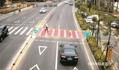 以情侣南路南往北方向,智能“电子警察”将斑马线分为A、B、C、D四个区域(如图)。当行人在A或D区等待时,智能“电子警察”就会提前做好监控“准备”。当行人踏入B、C两个区域时,智能“电子警察”立即开启“保护行人模式”。