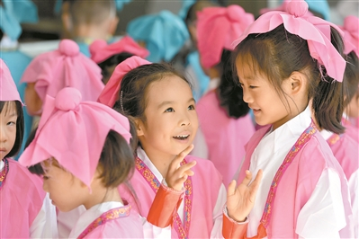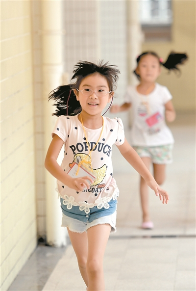 玫瑰小学的学生听到上课铃声后跑向教室。