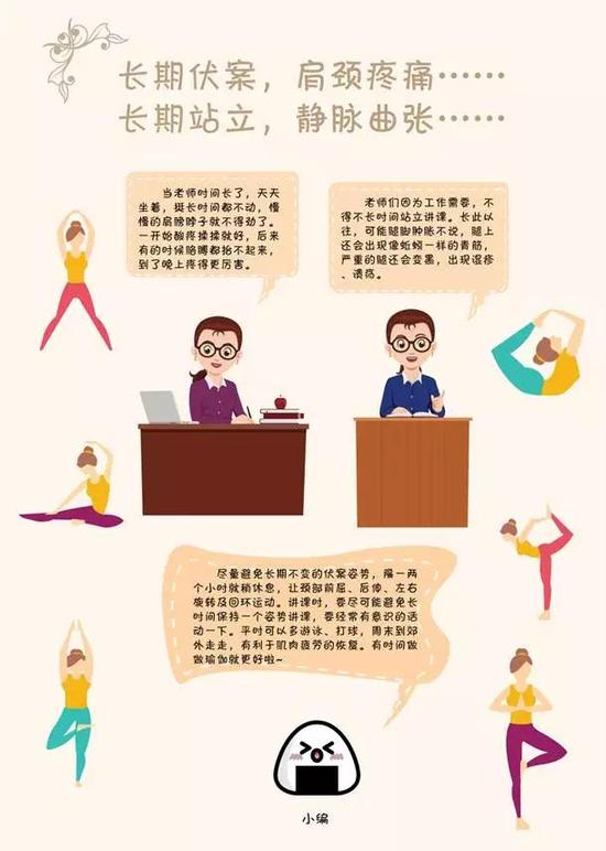在忙忙碌碌的教学生活中,无私奉献的老师们也要多关心一下自己的健康,心态要好起来,疾病来了要重视起来。合理安排好自己的休息时间,不管工作有多忙,也要抽空去户外爬爬山、和朋友喝喝茶。