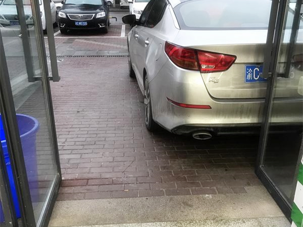 通过网友拍摄的照片,我们可以看到,一辆白色轿车直接竖停着,将进门处遮挡了一大半。门面前并没有划停车线。