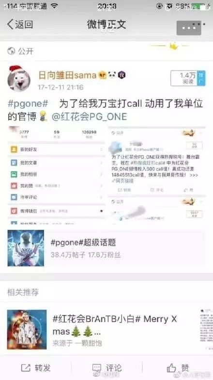 澎湃新闻发现,尽管周某发布的有关给娱乐明星打call的内容已经删除,但从网友保留的截屏了解得知,周某在利用其所在单位官方微博为自己喜欢的某娱乐明星“打call”后,还疑似通过个人微博发布消息称“为了我万宝打call,动用了我单位的官博@红花会PG_ONE”。